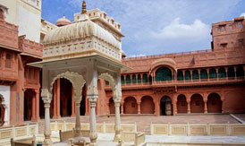 This fort was built by Raja Rai Singhji, the sixth ruler of Bikaner, who ruled form 1571 to 1612 AD. Raja Rai Singhji could Marshal the revenues of a Kingdom increased by the conquest of half Marwar and grant of half Gujrat and made use of ample funds from Jodhpur and Western Deccan for the construction of this fort. A contemporary of Mughal Emperor Akbar and Emperor Jehangir, he held a very high rank in Junagarh Fort, Bikaner the Imperial court. As a reward for this services as military commander, he was granted fields of Gujrat and Burhanpur by the Emperor. During his tenure in imperial service he traveled far and wide which gave him vision and great ideas about art and architecture and we can see how meticulously these ideas were incorporated in the architectural styles of his building in Junagarh fort.